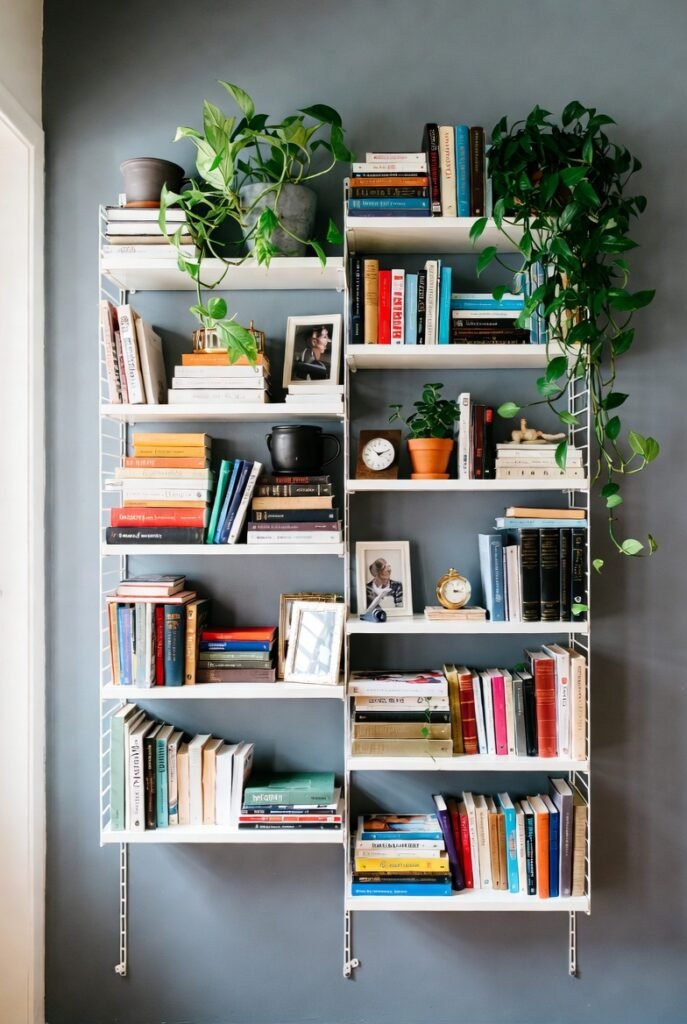 Floating shelves. Tall bookcases. Wall hooks. Pegboards.